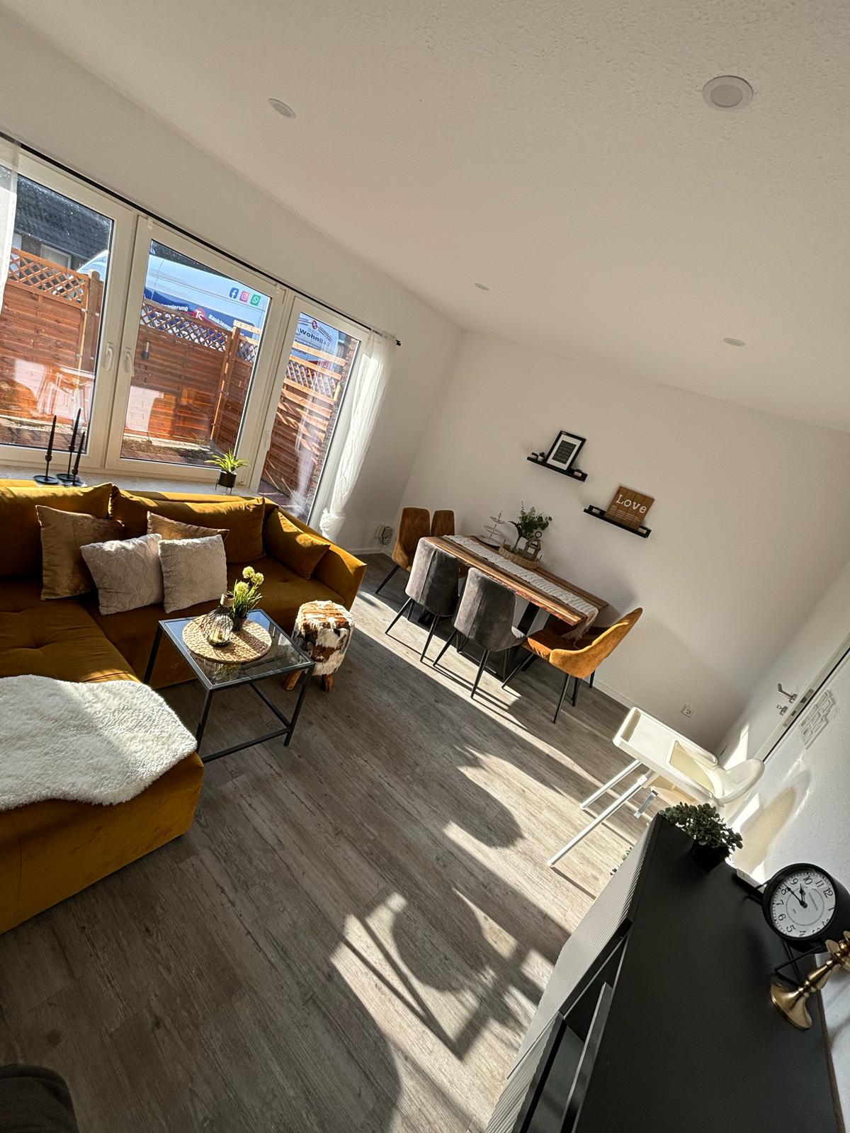 Das gemütliche Wohnzimmer lädt zum Entspannen ein – mit viel Licht, maritimem Flair und einem perfekten Rückzugsort nach einem Tag am Meer.